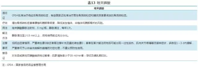 双膦酸盐(bisphosphonates)是焦磷酸盐的稳定类似物,其特征为含有P-C-P基团。是目前临床上应用最为广泛的抗骨质疏松症药物。双膦酸盐与骨骼羟磷灰石的亲和力高,能够特异性结合到骨重建活跃的骨表面,抑制破骨细胞功能,从而抑制骨吸收。不同双膦酸盐抑制骨吸收的效力差别很大[58],因此临床上不同双膦酸盐药物使用剂量及用法也有所差异[58,59]。目前用于防治骨质疏松症的双膦酸盐主要包括阿仑膦酸钠(表12)、唑来膦酸(表13)、利塞膦酸钠(表14)、伊班膦酸钠(表15)、依替膦酸二钠(表16)和氯膦酸二钠(表17)等[58,59,60,61,62,63,64,65,66]。
