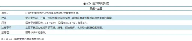 中医学文献中无骨质疏松之名,按骨质疏松症主要临床表现,中医学中相近的病症有骨痿,见于没有明显的临床表现,或仅感觉腰背酸软无力的骨质疏松患者("腰背不举,骨枯而髓减");骨痹,症见"腰背疼痛,全身骨痛,身重、四肢沉重难举"的患者。根据中医药"肾主骨","脾主肌肉"及"气血不通则痛"的理论,治疗骨质疏松症以补肾益精、健脾益气、活血祛瘀为基本治法。中药治疗骨质疏松症多以改善症状为主,经临床证明有效的中成药可按病情选用。可能改善本病证侯的,且药物有效成分较明确的中成药主要包括骨碎补总黄酮[116,117,118](表28),淫羊藿苷[119,120,121,122,123](表29)和人工虎骨粉(表30)。