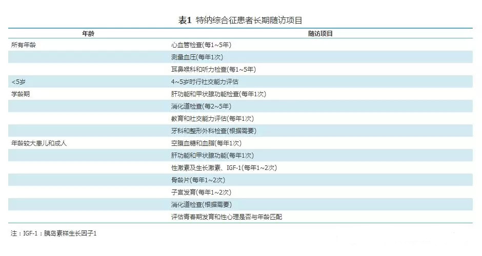 TS具有临床表现多样、症状出现时间多变、涉及学科较多的特点,因此TS患者诊断后需要长期随访,结合患者的年龄和发育阶段行相关项目检查,随访项目见表1[24]。